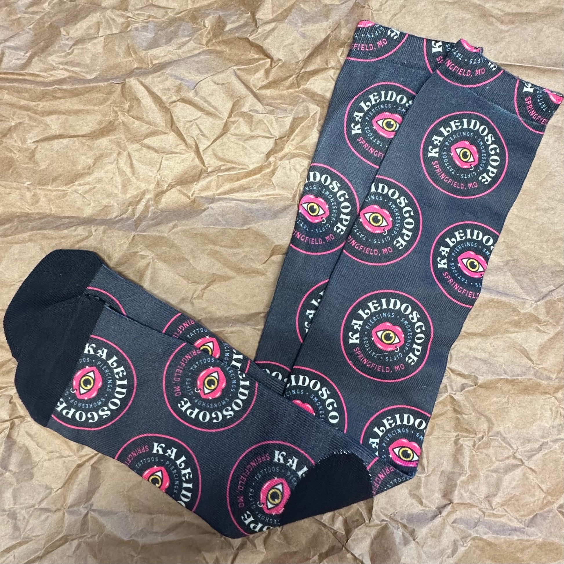 Experience ultimate style and comfort with our NEW Kaleidoscope Socks! Featuring our new logo, these socks are made from comfortable and stretchy polyester material for the perfect fit. Whether for work or play, these one-size-fits-all socks will add a touch of excitement to your day. Order now and step into a world of color and comfort!